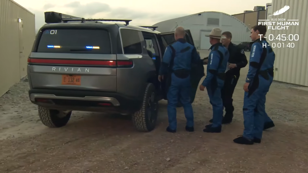走出训练中心,机组成员乘坐了一辆 Rivian 改装型电动卡车,前往不远处的发射场。值得注意的是,亚马逊也是 Rivian 的投资方之一。