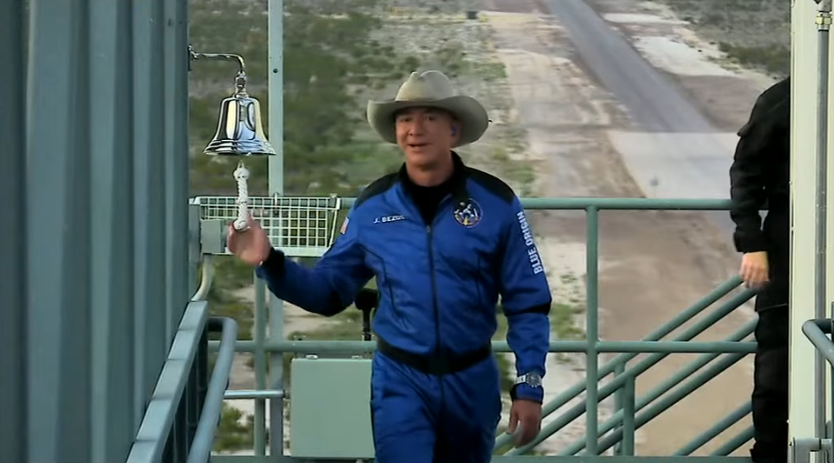 2021年7月20日,杰夫·贝佐斯、他的弟弟马克·贝佐斯 (Mark Bezos)、已入耄耋之年的女性航天先驱沃利·冯克 (Wally Funk),以及年仅18岁的物理系学生奥利佛·戴蒙 (Oliver Daemen)搭乘私营航天公司蓝色起源的新谢泼德火箭,越过海拔100千米高度的“卡门线”,首次进入“真正”的太空。
