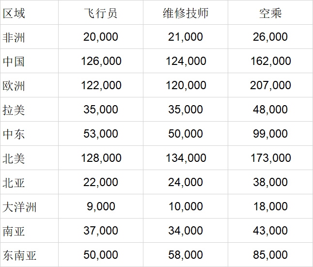 按照区域划分,未来20年针对新的飞行员、维修技师和空乘的预测需求如下