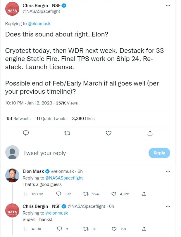 NASA在推特回复马斯克并猜测:如果一切顺利(按照您之前的时间表),可能会在2月底/3月初?马斯克回复:“一个很好的猜测”。马斯克这样回复,看来是进展非常顺利。